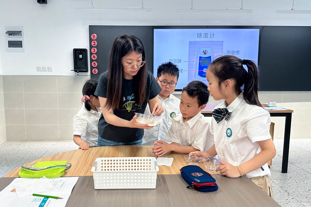 “为什么无锡人这么喜欢吃甜的?”“一个小笼包要跑多久才能消化完?”“无锡美食是健康饮食吗?”这些看似简单的问题,背后却隐藏着科学、社会、伦理、健康与文化的多重维度。围绕“饮食与健康”,学校以跨学科学习为路径,以数据分析为支撑,以生成式人工智能为辅助,引导学生走出教室,走进现实,让“食”与“思”共鸣。从无锡美食聊到地中海饮食、日本饮食,孩子们意识到环境塑造饮食,文化影响选择。一口小笼包,一次科学的糖分测试。孩子们在实验中惊喜地发现,科学不仅能解释“为什么这么甜”,更能帮助他们在日常中做出更合理的选择。